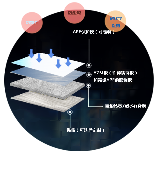 鋼板基材:高級(jí)APF覆膜鋼板、AZM板(鋁鋅鎂鋼板)