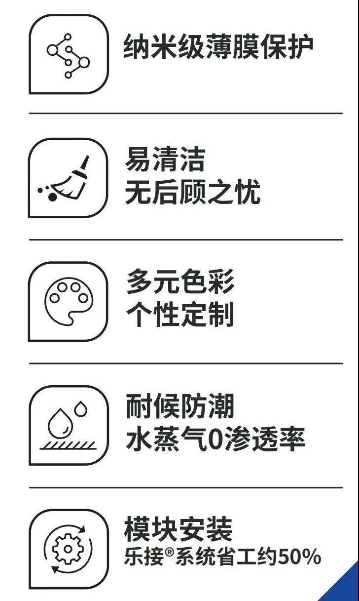 抗指紋系列鋁復(fù)合板表面具有防水防油防指紋附著,使表面光滑等功能的特殊涂料,相比于普通鋁復(fù)合板,表面更不易污染,可長(zhǎng)效保持板面清潔,降低清潔頻次,延長(zhǎng)使用壽命3年以上,具有