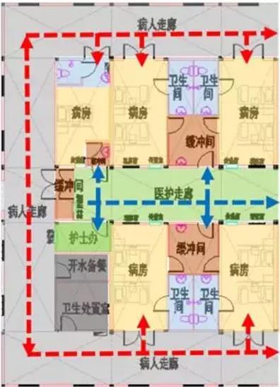 下面是武漢火神山醫(yī)院的局部病房平面圖,紅色虛線表示的是患者流線,藍(lán)色虛線表示的是醫(yī)生流線,兩種流線沒(méi)有交叉。