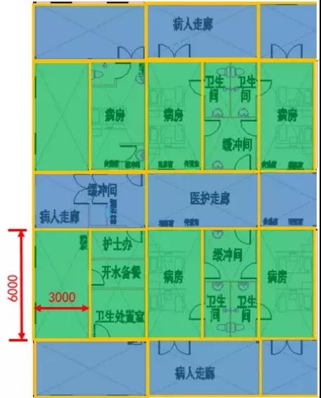 下面是火神山醫(yī)院的局部平面圖,可以看出,若干個(gè)6m*3m的模塊化尺寸通過(guò)水平與垂直方向不同的組合方式,形成了病房、衛(wèi)生間、緩沖間、病人走廊、醫(yī)護(hù)走廊等等不同的功能分區(qū),基本解決了傳染病醫(yī)院的流線及分區(qū)問(wèn)題。